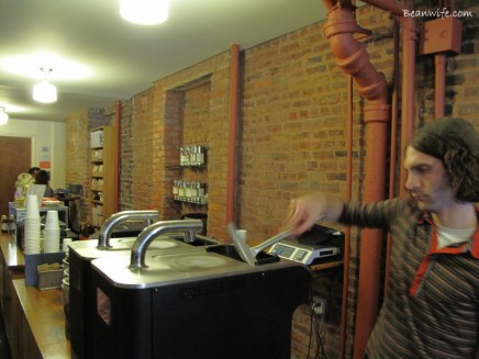한껏 흥분된 기분을 감추지 못하고 여기저기 기웃대는 민폐 콩부인. 다른 손님들은 뭘 주문하나 궁금한 마음에 지켜보다 보니 그 비싸기로 유명한 드립기계 ‘Clover’가 눈에 띈다. (약 2년 전 프렌치프레스를 자동화 한 혁신적인 기계를 스타벅스에서 냉큼 다 사들여서는 서부와 동부의 한정된 점포에서만 사용 중. 기계당 $11,000, 한화 약 1천3백만원 정도로 알려짐. 기계 작동법에 대해선 사진을 클릭하여 유툽 동영상 참고) 게다가 두 대나 있다니. 별다방의 독점 횡포를 뚫고 어떻게 사들였는지는 모르겠지만 적어도 좀 더 신뢰가 가는 빵모자 바리스타의 손길이라면 왠지 맛있을 것만 같다. 진하게 잘 내려진 커피를 받아든 아저씨의 표정도 몹시 만족스러워 보이고…