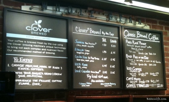 Jamaica Blue Mountain Tall size $4.5! 일단 가격으로 압도하는구나. 오늘의 커피 대비 3배, 다른 Clover 메뉴 대비 2배….덕분에 괜히 싸보이기까지 하는 Costa Rica Tarazzu Tall size $2.25 한 잔을 함께 주문한다. 그리고 간식과의 어울림(pairing)이 궁금하여 블루베리 스콘도 함께… 아. 돈 새는 소리. 줄줄- =_=;; 주문한 후 진열대에 놓인 원두 가격을 확인해보는데…헉! 0.5lb(226g)에 $40!!! 가격 보자마자 원두 사가겠단 생각은 이미 안드로메다로… (아마 한국에서는 훨~~~씬 더 비싼 가격에 판매되고 있을겁니다. 하지만 미국에선 이정도 가격이면 ‘농담하냐~’고 물을 정도의 수준임을 알려 드립니다.)