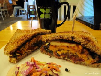 게다가 때마침 가볍게 주문했던 초식메뉴, 스윗포테이토 샌드위치도 때맞춰 나와주니 어찌 아니 기쁠수가…뻔하고 홀쭉한 채식 메뉴는 가라! 살짝 빵을 들춰보니 고구마, 시금치, 사과, 이탈리아 양파, 고트치즈 등등…달콤한 고구마에 온갖 야채가 든든하게(?) 어우러져 있어 이걸로는 호리호리한 채식주의자는 절대 될 수 없을 것 같다는 생각이…하지만 일단 한입 베어무니 달콤상큼한 맛에 기분은 다시 한 번 대폭 상승하고..
