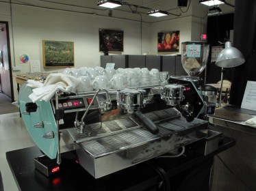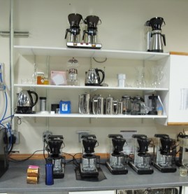 커핑룸 한켠에 가득 놓인 커피 추출기들. 일본 핸드드립도구는 물론 핫한 커피 메이커들이 늘어서 있고, 그 중에서도 Bunn사의 TrifectaSCAA인증 커피메이커 Technivorm Brewer가 눈에 띄었다. (단, Clover 와 더불어 Trifecta에 대해선 죠지하웰에게 그닥 좋은 평을 듣진 못했음.) 그리고 스포츠카 모양을 하고선 카페인 충전 대기중인 멋진 La Marzocco의 Mistral espresso 기계까지… 이곳에선 커피 골든컵을 찾기 위해 온갖 추출 도구들을 실험해 보는 듯 했고, 또 갓 태어난 각종 커피 도구들도 그 성능을 제대로 평가받고자 좋은 커피와 테이스터가 있는 곳으로 알아서들 모여드는 듯 했다. 그리고 난…그래! 바로 여기가 천국이지 싶었다. ㅋㅋ