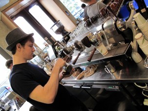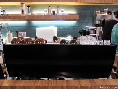 조금은 신경이 곤두서 보이는 카페 매니저 때문에 조심스레 눈짓으로 아는척 하는 친구. 오호~ 말로만 듣던 근사한 Slayer 머신 앞에 서있으니 근사한 바리스타처럼 보이는구나. 왠지 자랑스러운걸? 잠복하는 군용 전투기모냥 시크하면서도 뭔가 음산한 기운마저 느껴지는 Slayer espresso machine. 그리고 그 앞에 서서 커피에 집중한 모습이 사뭇 진지한 파일럿 같기도 하다. 벽걸이 TV와 평범치 않은 에스프레소 머신이라니…뭔가 익숙치 않은 분위기에 촌스럽게 살짝 긴장되는 1인.