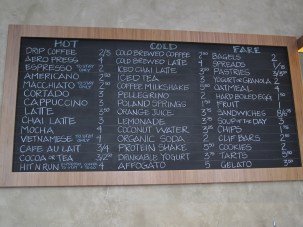 매장 뒷편에 가지런히 진열된 다양한 커피도구들이 말해주듯 다양한 메뉴에 몹시 고민되기 시작. 아아~가장 괴로운 순간이 아닐 수 없다. 하지만 다행히 결단력 지수가 높은 친구가 과감히 골라준 커피 3종세트를 주문하기로. 일단 더위를 식히는 애피타이저로 Cold brew(찬물로 추출한 커피:우리나라에서 흔히 더치커피라고 부르는)커피를, 이어서 따뜻하고 진한 국물(?)의 Aeropress(에어로프레스:프렌치프레스 원리를 응용한 추출도구)커피를 메인 메뉴로, 그리고 마지막 디저트는 베트남 커피! 이렇게 세잔을 한꺼번에 주문하니 결국 ‘커피 풀코스’가 되는구나. 좋아! ^-^b