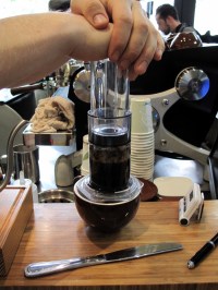 잠시 한가한 틈을 타 Ben이 또 다시 진지한 얼굴을 하고 Aeropress(에어로프레스)로에티오피아 Sidama(Sidamo로 흔히 알려져있지만 원래 Sidama가 맞는 표기라고합니다)를 메인커피로 내려준다. 꼭 주사기를 거꾸로 엎어놓은 모양의 도구에 조금 가늘게 분쇄한 커피를 넣고 약간의 물을 부어 프렌치프레스 추출하듯 잠시 뜸을 들인 다음 남은 물을 붓는다. 약 1 분간 추출한 후에 위에서 천천히 주사기 누르듯 내려주면 찌꺼기는 통에 남긴채 약간의 압력을 통해 내려진 진하고 깔끔한 시다마커피 추출 끝!