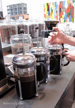 손님들은 꽤 젊은 듯 한데 공간은 어딘지 모르게 중후한 느낌이 있다. LP판이 빽빽히 꽂힌 DJ박스 때문일까? 커피도 내리고 음악도 종종 바꿔주는 바리스타. 하지만 밀려드는 손님들 때문에 조금 바빠 보인다. 그 와중에 내 코와 눈을 사로잡은게 있었으니…매 시간 종류를 바꿔가며 신선하게 우려내는 프렌치프레스 커피! 주방을 보니 때마침 큰 사이즈의 프렌치프레스 3개로 동시에 커피를 우려내고 있었고, 이후 골드필터에 한 번 걸러 보온병에 담아 정해진 시간 동안만 판매하고 이있었다. 이 때를 놓칠새라 막 나온 커피 한잔과 쿠키 하나를 주문하는 나. ^^v