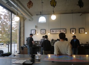 시카고에 3개, 그리고 LA에 3개, 이렇게 공식적인 인텔리젠시아의 직영 카페는 미국 전역에  6 곳 뿐이다. 시카고 매장 3곳 중 접근성이 좋은 두 개의 직영 매장을 방문해 보았다. 먼저 밀레니엄 파크라는 시카고 최고의 관광지 근처에 있는 밀레니엄 지점에 저녁 커피를 한잔 하러 방문했다. 깔끔한 매장 외관과 내부 조명이 빌딩 숲에 위치한 유명 커피 매장 다웠다. 특히 벽을 장식하고 있는 종이 아트들이 자칫 정 없에어 보일뻔한 매장의 분위기를 조금은 따뜻하게 만들어 주는 것 같아 반가웠다. 최근 저렴한 생두 가격과 독특한 향미로 환영받고 있는 온두라스 커피를 에바솔로(Eva Solo: 옷을 입힌 프렌치프레스 모양의 커피 메이커)로 주문해 보았는데, 침출 방식 특유의 부드럽고 묵직하면서도 따뜻한 시나몬 톤이 잘 느껴졌다.