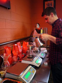 이 날, 본사 2층에 위치한 커피 랩에서는 인텔리젠시아의 홀세일 교육을 담당하는 Jesse가 판매중인 원두 라인업을 늘어 놓고 직접 커피를 내려 주었다. 생각보다는 소박한 느낌의 교육장이었지만 대회를 준비하는 바리스타들이 연습하는 곳이고, 실제로 월드 바리스타 챔피언을 배출해 낸 곳이라고 생각하니 괜히 커피도 더 맛있는 듯 했다. 실제로 Jesse가 그날 내려 준 커피는 종류 구분없이 모두 달콤했을 뿐만 아니라 원두 포장지에 적혀있는 대부분의 커피 맛을 느껴볼 수 있었다. 또한 크게 기대하지 않았던 멕시코 커피도 이 날은 이상적인 밸런스의 아주 매력적인 커피로 다가왔다. 호기심에 필자도 잠시 주전자를 잡고 커피 추출을 시도해 보긴 했지만, 같은 장비와 물로 역시 덜 맛있는 커피를 만들고 말았다. 이날 Jesse는 시카고 직영 매장에서 눈에 띄던 고기 저울 같은 큰 저울 위에 약 42g의 커피를 갈아 710ml 정도의 물을 부어 4분 이내에 추출하는 레시피를 사용하고 있었다.
